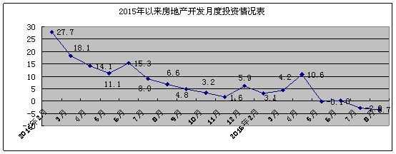 (一)开发投资继续回落。1-8月房地产开发完成投资226.9亿元,同比下降3.7%,较上月累计增速下降了0.8个百分点。从房屋用途看,住宅类完成投资165.1亿元,同比下降了5.1%,占全部投资的72.8%。其中,90-140平方米投资116.1亿元,同比增长3%,占全部投资的70.3%;90平方米以下同比下降29%,144平方米以上同比下降13.1%。商业营业用房41.5亿元,同比下降1.3%,占全部投资的18.3%。