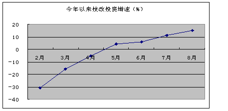 (六)工业技改投资力度逐步加大。1-8月份,全市工业技改投资完成627.4亿元,增长15.1%,分别比一季度、上半年、1-7月提高31、9.3、3.7个百分点。