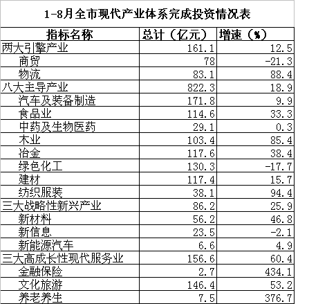 (三)制造业投资持续快增。1-8月份,全市制造业投资完成1024.9亿元,同比增长26.8%,增速同比加快12.3个百分点,占投资总量的比重由去年同期的45.7%提高到51.2%。其中,八大主导产业完成投资822.3亿元,增长18.9%;三大战略性新兴产业完成投资86.2亿元,增长25.9%。