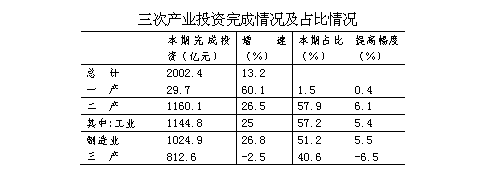 (二)二产带动全市投资增长。1-8月份,全市第一、二、三产业分别完成投资29.7、1160.1、812.6亿元,第一、二产业分别增长60.1%、26.5%,二产增速比去年同期提高10.8个百分点,拉动全市投资增长13.7个百分点;第三产业下降2.5%,比去年同期下降15.7个百分点。