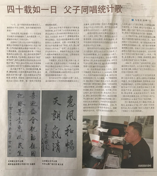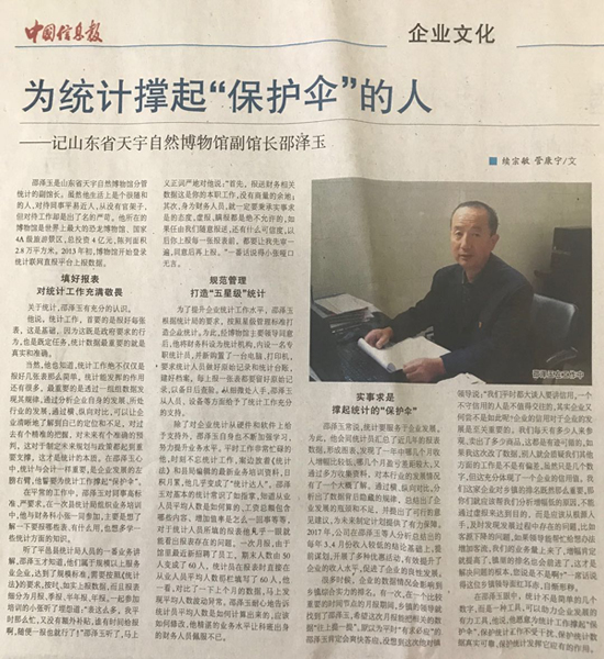 2017年11月24日,《中国信息报》7版头条刊发《为统计撑起“保护伞”的人》一文,介绍了山东省天宇自然博物馆副馆长邵泽玉从事统计工作先进事迹。同版以《四十载如一日,父子同唱统计歌》为题,介绍了平邑县莲花山建筑公司统计员孟庆磊统计先进工作事迹。