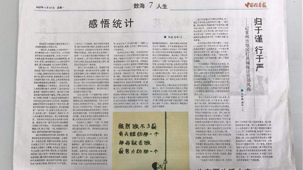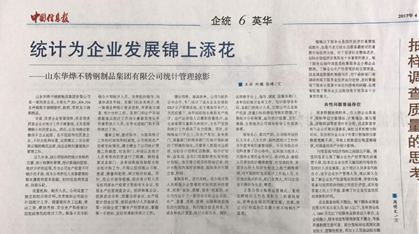 2017年4月17日,《中国信息报》六版头条刊发《统计为企业发展锦上添花》一文,介绍蒙阴县企业山东华烨不锈钢制品集团有限公司加强统计规范化建设先进经验。同日,该报七版头条以《感悟统计》为题,刊发兰山区企业恒源热力集团有限公司企管部统计员张琳琳同志的先进事迹。